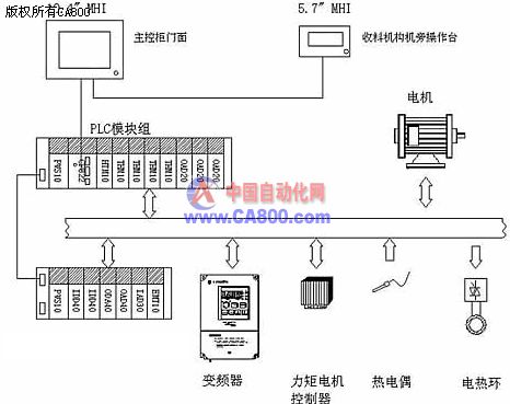 主电机采用变频控制,其速度可以在主/从触摸屏人机界面上设置。速度可多级调节,开机调试时低速运行,正常生产时高速运行,其速度的变化直接关联到牵引机构和收料机构。加热环由可控硅控制,其触发由PLC热电偶模块的PWM输出点控制,温度更加稳定平滑。