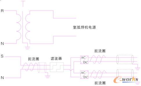 在本案例中,氩弧焊机电源与伺服驱动器供电电源分别供给。氩弧焊机电源用隔离变压器隔离,伺服电源线外套一个扼流圈后送入有源功率滤波器,经过滤波后,再送至开关电源。伺服驱动器的动力电源和控制电源用2个开关电源分别供电,且在接入驱动器前分别套一个扼流圈。驱动器电源与控制(编码器)电源均连接了屏蔽线,并确保单端可靠接地。如附图为系统接线图。