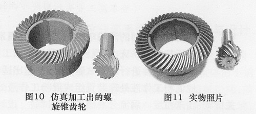 选择一对螺旋锥齿轮,其加工参数如表1。将参数输入仿真程序,运行程序后可在CATIA V5窗口中看到加工过程。图9为仿真加工过程的一幅瞬时图。加工完成后,对模型添加其它特征后可得最终模型图,如图10。图11是在YH603铣齿机上用与加工仿真软件相同的数据,实际加工出的一对相啮合的螺旋锥齿轮实物照片。从图上看,加工仿真图和实物图的齿形齿向是一致的。经实际检验,仿真结果与实际结果也是符合的。由此说明数控加工仿真系统可以非常精确地模拟出CNc铣齿机实际加工过程,仿真结果是准确、可靠的。