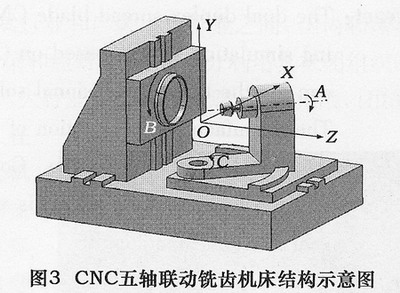 螺旋锥齿轮全数控化加工机床使用三个正交平移运动轴(X、Y、Z)和两个轴线正交的回转运动轴(A、B)代替复杂的摇台鼓轮、刀倾机构,实现了螺旋锥齿轮的展成加工。其结构如图3所示。O-XYZ是机床坐标系,摆动座绕Y轴的旋转、工件齿轮绕自身轴线A的旋转、刀盘沿X轴和Y轴的平动和工件头箱沿Z轴的平动,以上两个旋转运动和三个平动分别代表了CNC机床的B、A、X、Y和Z五个联动轴。它把螺旋锥齿轮加工原理、控制方法和动作浓缩在最小限度的三根线移轴和三根回转轴上。由于五坐标数控机床能够在加工空间中实现刀具相对工件的任何位姿,因此完全能满足螺旋锥齿轮的数控化加工。