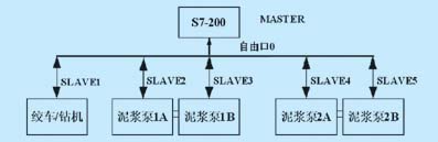 多年来,我国钻机市场一直以机械钻机为主,通过柴油发电机带动变速齿轮箱来调节绞车和泥浆泵的转速,效率低下,耗能高,故障率高。随着国际钻机市场电驱动钻机的推广与普及,我国的钻机经历了购买二手旧钻机,进口新钻机到自主生产的过程,在此基础上,钻机也进行了一次大的更新,从模拟电路控制直流传动到数字化的直流传动设备,再到到高性能的具有通信功能的传动设备;在钻机实现自动化过程也经历了由继电器到开关量PLC再到高性能PLC(模拟量+总线通讯)的过程,现阶段钻机设备配置以高性能PLC控制为主,通过通讯功能读取数据和并根据工况改写驱动器的相关数据,这样先进的控制理论(模糊控制、神经网络控制等)就很容易的通过上位机实现,从而控制交直流驱动器实现调速的智能化。该系统通过S7-200 CPU226作为主站,五台6SE71系列变频器作为从站,其中650kW的变频器带动绞车/钻机,500kW的变频器两两同步工作,带动1300系列的泥浆泵,参见图1。