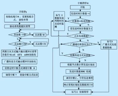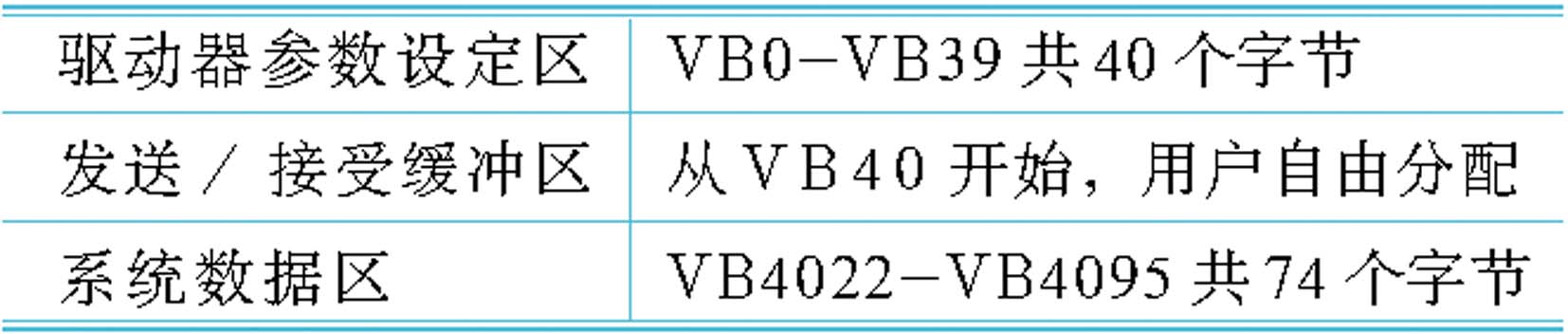 其中驱动器参数设定区主要完成从站数目(VB0)、每个从站LAE长度设定(VB1-VB31)、广播传送方式LAE(VB33)长度、传送时间(VW34),初始化发送/接受缓冲区首地址(VD36)(设定值为VB40-VB4021),其中V表示可变、B为字节、W为字、D为双字。