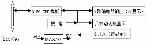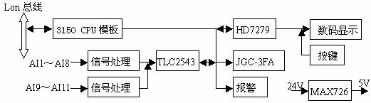 ⑵ 温、湿度控制器硬件设计如下:温、湿度主控制器要求有较大的存储空间和处理能力,可采用3150CPU模板,该模板具有48KB 2PROM和8KB RAM空间,带有FTT-10A自由拓扑收发器;电源部分使用MAX726芯片,滤波后能够得到稳定的+5V电压;HD7279是一片具有串行接口、可驱动8位共阴式数码管,可以连接64键的智能显示驱动芯片;A/D芯片采用TLC2543,为11路模拟信道逐次逼近型12位串行AD,精度高,响应时间短,接线简单;5个按键,可进行手/自动切换和参数的直接修改;继电器使用JGC-3FA,体积小,驱动能力大(可直接驱动380V交流设备),使用寿命长。