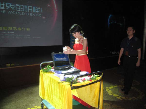 在五彩的灯光效果和动感的音乐旋律烘托下,由研祥员工组建的产品模特队着实让人眼前一亮。盛装的产品Model一边展示着手中的产品一边款款走向前方讲台,每一款产品都是经过精心挑选具有代表性的年度新品,因为模特的展示,这些平时让人倍感生硬的高科技产品似乎突然间变得活泼生动了许多。顷刻间,闪光灯此起彼伏照亮了整个会议厅,大家竞相拍照,气氛格外热烈。除了产品秀环节,研祥“极地酷霸系列“坚固笔记本低温、淋水试验和现场跌落演示也给与会者留下了深刻的印象。放置在冰块上的坚固笔记本在干冰气体的包围下若隐若现,笔记本通电运行后,演示人员将一杯水从其上方倒下,水顺着屏幕积聚到键盘上,笔记本仍然能够正常运行。即使是从