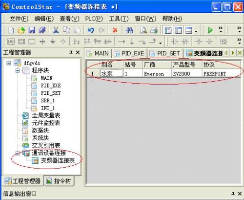 2、EC20控制器通过COM0端口与人机界面通讯,人机界面作为主站,通过EMERSON PROTOCOL 协议与可编程通讯,控制器为从站,通过MODBUS协议通讯。通过COM1端口与变频器通讯,可编程控制器此时作为主站,变频器为从站,采用的是自由口通讯协议。