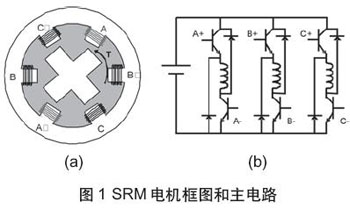 开关磁阻电机(SRM)具有诸多明显优势,例如结构简单、高起动转矩、高效率、高可靠性和低成本等等,正不断引起各行各业的关注。图1(a)所示为一个典型的6/4三相开关磁阻电机。电机为双凸极结构,转子既无绕组也无永磁体;定子各极上绕有集中绕组,径向相对极的绕组串联,构成一相。开关磁阻电机的运行基于“磁阻最小”原理—磁通总是要沿磁阻最小的路径闭合,因磁场扭曲而产生磁阻性质的电磁转矩。在电机运行时, 每相绕组只有在该相电感处于增加阶段时通电,而在电感处于减少时必须断电。图2(b)所示为该电机相应的主电路。两个半导体开关器件必须同时导通, 两个二极管在两个半导体开关器件关断时同时导通。决定电机转子旋转方向的是各相绕组的通断点顺序(换流表)而不是电流方向。显然,电机的换流时刻与转子具体位置直接相关。
