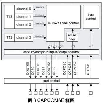 如图3所示,CC60-CC62和COUT60-COUT62是用于驱动电机的六个基本输出信号。对于开关磁阻电机控制,转子位置反馈信号由CCPOS0-CCPOS2输入。T13生成的高频PWM信号将以高达50ns的分辨率,加至T12的CC60-CC62和COUT60-COUT62输出中的任何一个的有效电平。CTRAP是紧急中断输入。如果该输入为低,CC60-CC62和COUT60-COUT62将立即变为预定义的电平,以实现过流/过压保护。用户仅需设置各种寄存器的值,例如周期寄存器、比较寄存器、偏移寄存器等等,即可轻松快捷地控制CAPCOM6E。