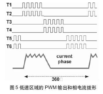 如图2所示, 当电机转速较低时,两次换流之间的间隔足够大, 常见的固定频率电压型PWM调制用于控制电流幅值及其变化。