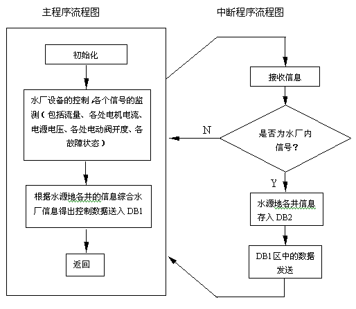 水源地主控室间隔1分钟向聊城水厂通过大功率无线电台传送水源地的水量情况及井的运行信息,20个字节,以便于上级单位的统一调控和调度;同时从聊城水厂接受上级控制站的控制信息,20个字节。