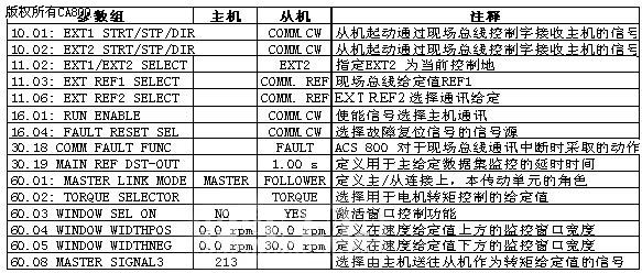 ACS800变频器的主、从功能是为多传动应用而设计的,,其中系统由若干个ACS 800 变频器驱动,同时电机轴通过齿轮、链条或传送带等相互耦合在一起。由于这种主、从功能,负载可以均匀地分配在传动单元之间。