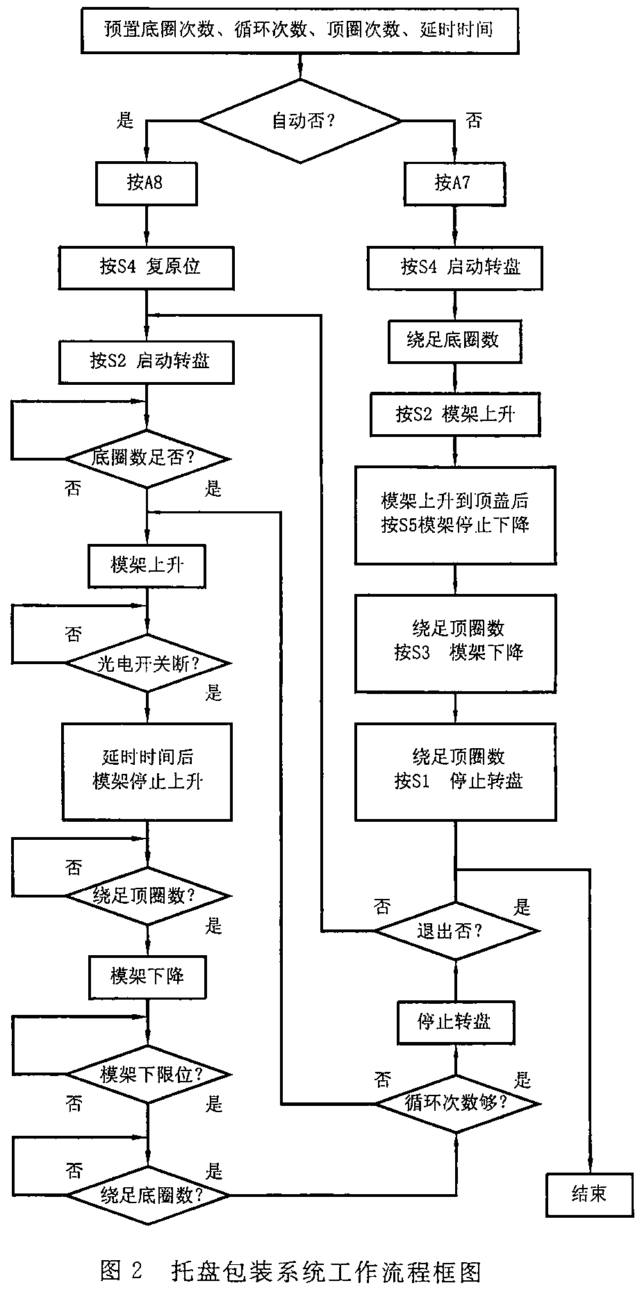 | 摘要:介绍PLC在玻璃瓶托盘包装控制系统中的应用,较详细地叙述了系统的硬件配制和软件设计。投入运行结果表明效果良好。 关键词:玻璃瓶罐;托盘包装;可编程控制;硬件配制;软件设计 随着对玻璃酒瓶质量(包括外观清洁度)要求的不断捉高,传统的麻袋包装方式已不能适应生产和市场的需要。我厂现用的托盘包装正好能克服麻袋包装的弊端,可减少包装和运输中玻璃瓶(尤其是螺口瓶和异形瓶)的破碎,同时也避免了因麻袋放久后在瓶子上的积灰甚至被粘附上麻袋腐朽物的难题。 由于成套的在线玻璃瓶托盘包装机的机械结构复杂,安装要求严格,设备投资较大,所以我厂选用了结构简单、使用方便、成本低廉的PLC托盘式缠绕机,它以LLDPE拉伸薄膜为包装材料,对托盘上的玻璃瓶进行拉伸裹包。包装后的托盘十分适宜玻璃瓶罐的储运,极大地减少了瓶子破损率,还提高了瓶子的清洁度。 1 玻璃瓶托盘包装工艺要求与系统工作过程 先将玻璃瓶从递送带上用人工装满托盘(可根据瓶子尺寸分若干层,规格1300mm×1300mm;高度800~2200mm),并用手动液压搬运车拉到Φ1650的钢板转盘上。再将宽度为500mm、厚度为17~35μm的LLDPE拉伸薄膜穿进托盘下端。通过“人机界面”选择“手动”或“自动”工作模式。 系统工作过程:先启动转盘,接近开关接通,送膜电机转动,让薄膜在托盘下端绕2圈(圈数可设置)。由于光线被匀速转动托盘上的玻璃瓶阻挡,使得固定在薄膜架上、且对准被裹包玻璃瓶的光电开关“暗通”,所以薄膜架带着薄膜和光电开关上升。当薄膜从托盘下端裹包到托盘上端玻璃瓶时,升高了的光电开关可以接收到托盘外的光线,致使光电开关“亮断”。但为了让顶端盖边裹包严密,可以设置在光电开关“亮断”后,让薄膜架继续边包瓶边上升数秒钟(注意:薄膜架只作上下运动,而托盘始终在匀速转动)才停止,并再在托盘的上方缠绕2圈(圈数可设置)。然后薄膜架下降,再让薄膜从上往下裹包玻璃瓶。最后在托盘下端又缠绕2圈薄膜,托盘停止转动。玻璃瓶托盘包装结束。 2 系统硬件配制 系统总体结构如图1所示。可编程控制器TSX08CD8R6AS为整个系统的榨制中心,该PLC功能齐全,可减少许多中间接触件,便于实现简化布线,优化设计,提高设备运行的可靠性。又采用TSX08H04M型人机界面,可方便选择“手动操作”、“自动运行”、“参数设置”等5页画面,以分别进行系统调试、参数设置、调整和选择系统运行的方式等。同时外接变频器U1、U2、U3,用以分别控制转盘电机、薄膜架升降电机和送膜电机转速。另外,PLC的输入还分别接人S1“托盘原位”、S2“膜架下限位”、S3“高度限位”、S4“膜架上限位”、S5“进膜启动”和S6“紧急停止”等开关信号,以使系统正常、安全运行。 3 系统软件设计 按照“包装工艺要求与工作过程”要求,该托盘包装系统有手动模式和自动模式两种使用方式。使用手动模式时分别手动按“人机界面”操作面板上的“A1”~“A8”专用按键1次或数次。遇到特殊紧急情况可按动S6急停按钮,使系统紧急停止。使用自动模式前必须先预置好“底圈缠绕次数”、“顶圈缠绕次数”、“上下运行循环次数”和光电开关在托盘顶端受光后薄膜架停升的“延时时间”。然后按动A8将画面翻至自动运行页面。工作流程框图如图2。 设计时还要注意:允许分别调整转盘电机、薄膜架升降电机和送膜电机3台变频器的控制频率设定值,使3台电机转速配合合适,让玻璃瓶的包装效果最佳;为了安全运行,还应分别考虑薄膜架的升降极限位置;因某些异形玻璃瓶层间进光较强,需适当修正光电开关方向或调节光电开关感测距离。另外,不允许在自动停止过程中按动S6按键使其急停 ![]() ![]() |