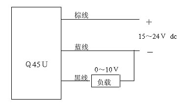 Q45ULIU64ACR 型超声波传感器将测量的距离值转换为模拟量(电压或电流)输出。可检测范围为100mm~3.0m,分辨率为距离的0.1%(最小0.25mm),线性度为满量程的1%,并带有温度补偿。由于车钩的标称高度大多在880mm 左右,允许检测误差为±0.2%,因此该传感器能够满足系统要求。Q45U传感器接线方式如图3 所示,图中棕线、蓝线和黑线分别为传感器电源正极、负极和电压输出。其中模拟量0~10V线性对应于一定范围的距离值,其输出经分压电路(将0~10V降为0~5V以适应单片机A/D转换器的输入要求)接入单片机的A/D 转换器。由A/D 转换器采样测得电压值,经程序处理得出高度值。
