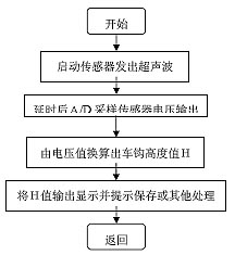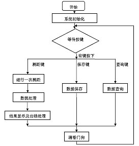 按下开关键启动系统后,系统将进行各部件的初始化,等待键盘的输入。若按下测距键,系统将控制超声波传感器发射超声波,接收回波,处理数据,得出测量值并通过显示器显示出来,供用户保存或其它处理;若按下保存键,系统自动对测量得到的数据进行保存供用户以后查询;若按下查询键,即可对历史测量数据进行查询访问,键盘上还设有向上和向下翻页的按键,方便用户查询。