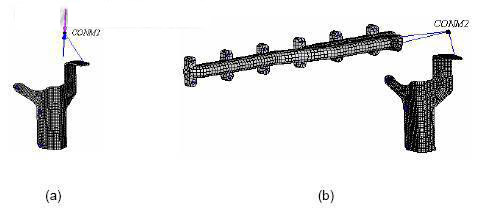 排气制动阀支架主要起支撑发动机涡轮增压器的作用。某发动机排气制动阀支架在使用过程中出现断裂,为了找出断裂原因,对该支架进行了强度校核和排气系统模态分析,强度分析模型和系统模态分析模型分别见图6(a)和图6(b)。