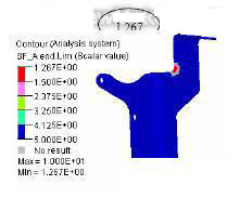 重型车上的发动机后悬置支架因为经常承受较大的动载荷而断裂,导致严重车祸,因此,该结构应该保证具有足够的动态安全储备系数。为了降低产品开发费用,缩短生产周期,某重型车发动机后悬置支架在开发设计阶段要求校核结构强度。在进行有限元分析时,考虑发动机后悬置支架经常承受较大范围的动载荷,因此计算时增加了相应的安全系数,载荷变化范围设在:-4Fz ~ + 6Fz 之间,Fz为发动机后悬置支架匀速行驶于平路上的载荷。通过有限元分析和动态疲劳安全系数分析,从图3 的疲劳安全系数分布云图中可以得知,该支架的最小安全系数为0.87,小于安全系数阀值1,因此该支架设计方案不满足强度设计要求。