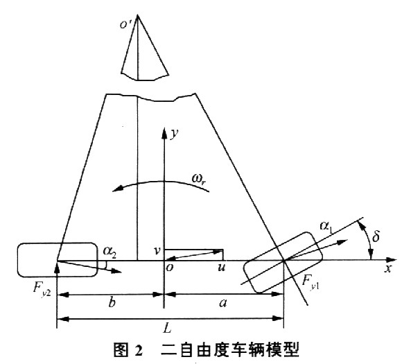 该车辆模型中。假定轮胎的侧偏角与侧向力的关系是线性的,同时不考虑地面切向力对轮胎侧偏特性的影响,也不考虑空气动力的作用。将车辆简化为线性二自由度的模型,忽略转向系统的影响,直接以前轮转角δ作为输入;忽略悬架的作用,认为车辆车厢只作平行于地面的平面运动;车辆沿x轴的前进速度u视为不变,因此,车辆只有沿y轴的侧向运动和绕z轴的横摆运动两个自由度。线性二自由度车辆模型如图2所示。