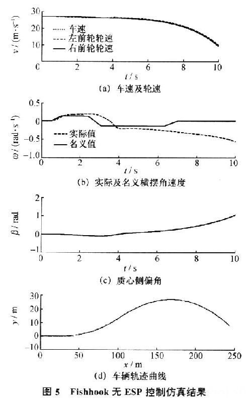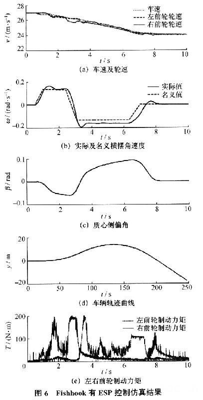 从仿真结果可以看出,没有施加ESP控制之前,横摆角速度的名义值与实际值之间出现了很大的偏差,而且表征车辆横向稳定性状态的车辆质心侧偏角一度出现大于1 rad时,车辆明显失稳。从车辆的轨迹上也可以看出,车辆横向偏移大,已偏出实际跑道。而施加了ESP控制之后,从制动力矩曲线可以看出,控制系统对车辆进行了必要的制动力干预,使得车辆的实际横摆角速度与名义横摆角速度保持在允许的范围之内。车辆的质心侧偏角也控制在了正常范围以内,保证车辆的稳定性。制动施加过程中,车轮也没有出现抱死的情况,说明控制算法中ABS制动小循环发挥了作用。从车辆的轨迹曲线来看,车辆能够完成正常的Fishhook动作。