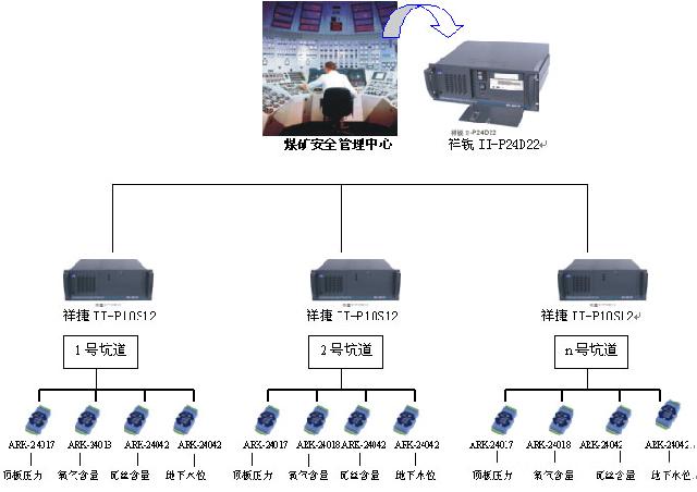 能够将矿井,坑道里面的一些影响煤碳生产安全外来参数,包括空气的瓦丝含量、井下水位、氧气含量、顶板压力等外来参数实时的采集到煤矿管理中心,在管理中心服务器得到这些数据后,通过软件对采集来的这些数据进行实时的分析,来测评这些数据是否合格,从而来确定矿井,坑道生产条件是否安全,从而为安全生产提供有利的保障。要求使用研祥产品搭建完整的采集,通信,软件处理,报警系统。