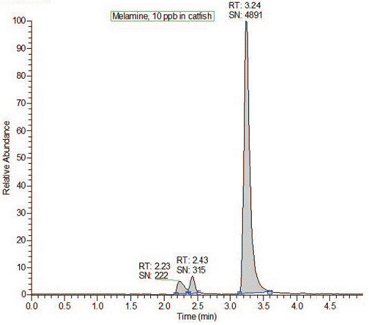 测定鲶鱼中的三聚氰胺残留的现有方法(实验室信息通报No. 4396)是由位于丹佛的食品药品监督管理局动物药物研究中心建立的。该方法使用TSQ Quantum质谱仪,配备了Thermo Scientific的SurveyorTM型LC-MS型液相泵和自动进样器。方法表明Thermo Scientific的仪器能够检测出鲶鱼提取物中10ppb水平的三聚氰胺,超过了食品药品监督管理局规定的要求。