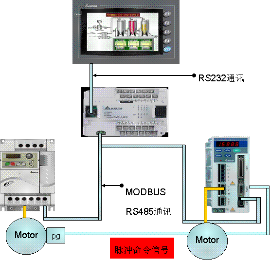 新型高速并条机采用全系列台达机电一体化技术实现单一自动化平台工艺控制过程。控制系统框图如图2所示。项目由DVP60ES00R2型PLC负责控制全机的运行,同时配备DOPA57GSTD或者DOPAS57BSTD型号触摸屏,PLC与触摸屏之间采用RS232方式通讯,运用中文与图形符号显示产量.条速.转速.定长.班次等参数,并对出现的故障进行实时显示,使控制更加人性化,即利于全机的操作,也方便了管理,而PLC与伺服驱动器以及E系列变频器之间通过MODBUSRS485方式实现数据交换和通讯控制。