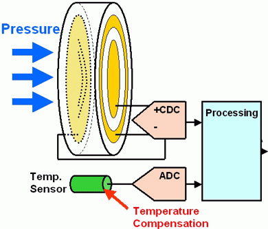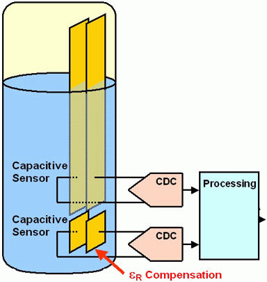 由于热扩散,温度传感器需要考虑改变的几何形状。设想两个电极中的一个附着在芯片上,另一个附着在由金属或陶瓷构成的支架上,因此支架自己作为传感器。以陶瓷为例,能够承受非常高的压力和侵入的媒介。与经典的惠斯通电桥相比较,电容压力传感器的主要优点是对输入电流的要求更低,使得他们特别适合于诸如轮胎压力控制之类的应用。 在一个液位传感器中,一对固定的导板浸没在要测量的液体中。制造商能够以非常低的成本制造出印制导体。第二对导板附着在底部,可以检测出由于温度或其他影响导致的电介质变化,如下图所示。