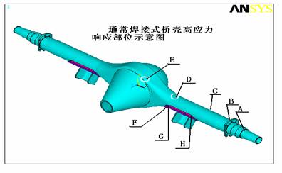 本文对车后桥壳的分析是建立在简化约束及假设基础上,计算分析研究得到的结论是:方案C ,可以达到不增加桥壳应力响应的条件下,有效的压低焊缝应力响应,如前期实验的疲劳源的确发生在焊缝上,属于平衡杆支架焊接方面的问题,改进方向是尽可能弱化平衡杆支座刚度,降低对桥壳的附加约束并减小焊缝应力响应,改进方案将是有效的,但如果疲劳源发生在桥壳过度段(D、F点)改进方案的效果很难预测。用户须对实验实物疲劳断口进行研究,判断疲劳源位置。因此,应用CAE方法进行优化设计,对不同结构、零件和材料,需要产品设计部门应用积累评价数据库进行评价,在还没有建立这个评价数据库的条件下,对上述桥壳的高应力响应,是难以明确其强度寿命评价结论及疲劳破坏情况,还有待进一步研究。
