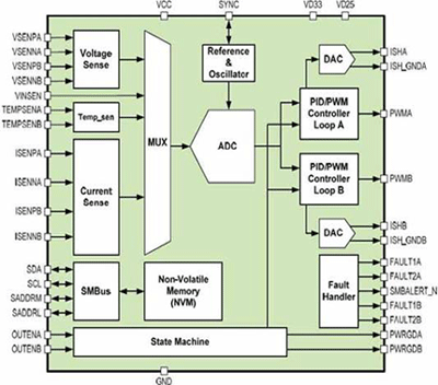 PX7522可以配置成提供2个独立的稳压输出,或者在单输出模式下的双相位输出,支持DCR和RDSon电流感应拓朴结构,0.5V到8V的宽输出范围。该组件是高度可配置的控制IC,利用PMBus和内建非挥发性内存,可以实现更广泛的用户友好的控制和实时系统监测。