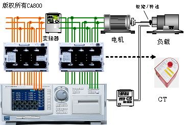 此测试电路是一个完整的变频器测试方案,包括三相电源输入、三相输出、驱动的电机的机械输出(转速、扭矩)等。如果被测的变频器功率较大,输入、输出电流超过了仪器的量程,就需要在电流的测量回路里接入CT(电流互感器),把被测电流转变成仪器的测量量程内。