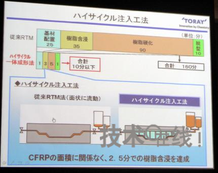 从设置预制品到取出成形品的成形周期,RTM法所需时间长达160分钟,无法达到汽车部件的量产要求。而高周期一体成形技术在基本实现自动化作业的基础上,改进了树脂特性和注入方法,将生产周期缩短至10分钟以内。