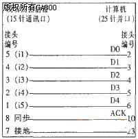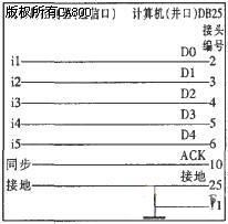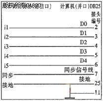 图3宁波海曙富茂机床应答传输接线图 (3) 同步传输接线图。 与应答传输类似,同步传输也是通过计算机并口的2、3、4、5、6针脚输出信号模拟光电头的方式。在同步传输方式下计算机并口与线切割控制器通信口的常用接线图如图4所示。 (4) 传输参数设置。 在使用通信电缆将计算机与线切割控制器联接后,还需进行传输参数设置。在CAXA线切割软件主菜单中单击[线切割】>[代码传输】>[传输设置>命令,系统会弹出“传输参数设置”对话框,此时可设置应答传输和同步传输的参数,其主要设置参数包括有效电平、暂停码、代码格式及端口地址等。国内快走丝线切割控制器生产标准一般为:应答传输的单板机是低电平有效,暂停符为D;而同步传输的单板机是高电平有效,暂停符为D。