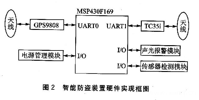 该防盗装置采用GPS9808模块搜索汽车的位置、速度等状态信息,通过MSP430F169单片机处理这些信息和检测汽车钥匙开关、车门等传感器状态,并利用GSM模块TC35i与用户建立通信控制的联系。其硬件实现组成如图2所示。该装置包括GPS定位模块、CPU控制模块、GPS通信模块、传感器检测模块、声光报警模块、电源管理模块组成。具有体积小,功耗低,功能多等特点,是一种性价比较高的汽车防盗装置。该装置主要组成电路的功能及特点: