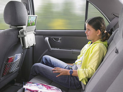 荷兰·Bogeruzu生产的在车座椅头部能够安装便携式DVD播放器的车载AV附件。以1个专用扳子固定在车座椅头部后方,可以安放长度为18.5~27cm,厚度3.3cm,重量1.5kg以内便携式DVD播放器和笔记本电脑等。