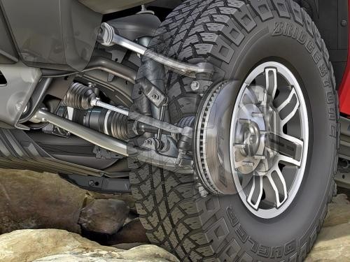 通用悍马H3的双叉臂前悬(能承受住越野时崎岖路面对底盘的强大冲击)