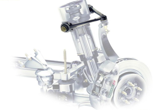如果是前轮驱动的车型,那么装配在前轮上的双叉臂悬架在上下控制臂之间除装配有传动机构外,还有转向机构,这使得其结构比不带转向机构的后轮要复杂得多。在转向机构中,转向主销由转向托盘与上下控制臂的连接位置和角度确定,转向轮可绕主销转动,同时也可随下控制臂上下跳动。在双叉臂悬架中通常采用球头连接来满足前车轮的运动需要:上下控制臂与转向主销的连接部位既要支持前轮实现转向又要控制车轮的上下抖动。不过由于上下控制臂的长度差问题,这也对双叉臂悬架的设计提出了严峻的考验——如果上下控制臂的长度差过小,车轮抖动时会造成左右轮距偏大,加快轮胎外侧磨损;反之,如果上下臂长度差过大,则会造成车轮转向时外倾角过大,使轮胎内侧磨损加快。因此,通过增加上下控制臂的长度来减小轮距的变化和控制外倾角的变化不失为一个好办法。