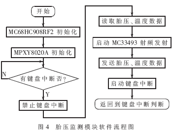 胎压监测模块的功能是准确、及时地监测各轮胎的内部气压、温度数据并发送,其软件流程图如图4所示。模块上电后,首先控制器MC68HC908RF2对自身及传感器MPXY8020A进行初始化。为了降低能耗,延长电池的使用寿命,控制器在没有数据需要处理和传输的情况下,将自身配置成STOP模式,同时将传感器配置成STANDBY模式,传感器在此模式下其OUT引脚每3秒会唤醒(下降沿触发)控制器响应键盘中断。控制器在中断处理程序中,通过修改传感器的工作模式,分别读取采集到的胎压和温度数据,然后启动射频发射模块将数据以曼彻斯特编码方式发送出去,同时进入省电模式,等待响应新的中断。