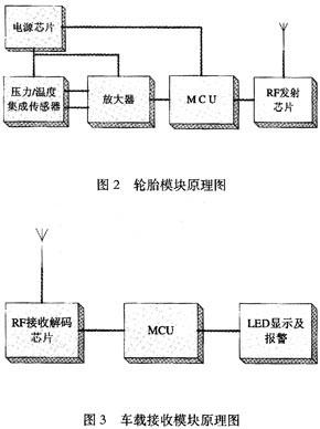 该系统的基本工作原理如下,把轮胎模块装置在轮胎内,压力和温度传感器检测轮胎内部当前的应力和温度信息,获得的模拟信号经过A/D变换器转换成数字信号,然后通过射频发射器发送出去。车载接收模块装置在驾驶室内,射频接收器接收来自轮胎模块的应力和温度信息,当轮胎压力过高或者过低时,通过显示和报警装置发出报警信息。
