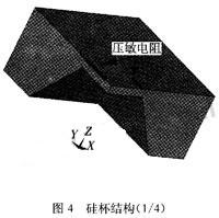 其中,压阻式压力传感器主要是利用半导体的压阻效应,把一个惠斯通电桥做在一个硅杯上,如图4所示。当硅杯受到压力后发生形变,惠斯通电桥的四个桥臂电阻就会发生变化,打破了电桥的电平衡,从而会有一个电信号的输出。