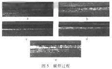 b. 手工焊盖面横焊工艺采用的是加摆停留的方法,由于人工操作的灵活性,焊接过程中摆动频率、幅度和停留时间均可实时改变,故一般宽度的盖面焊可一次成形。由于该机器人缺乏人的灵活性,我们通过模仿人工的盖面过程横焊,采用高焊速加快速摆动或不加摆动多道成形的横焊盖面方法。这样就避免了横焊盖面淌流的发生,也取得了不错的效果。图5a、图5b、图5c、图5d、图5e 依次为横焊背面成形、打底焊、盖面第一道、第二道、最后盖面成形。