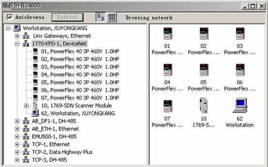 (1)配置计算机接入DeviceNet网络。硬件使用1770-KFD,软件使用RSLinx。当计算机通过串口与1770-KFD的RS232接口连接好后,则软件的配置过程如下:启动RSLinx,点击“Communications”——“Configure Drivers”,则会出现“Configure Drivers”的对话框,在上方的下拉表里选择“DeviceNet Drivers (1784 PCD/PCIDS,1770-KFD….)”此项,接着在出现的驱动选择对话框中选择“Allen-Bradley 1770-KFD”,然后再简单地设置一下就行了。又当1770-KFD的DeviceNet接口接到DeviceNet网时,在Rslinx就会出现类似本系统的画面(如图4)。