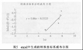 取lnt行和lnln{1/[1-F(t)]}行点击“图表向导”,依次点击“X-Y散点图”、“添加趋势线”、“线性”、“趋势线格式”、“选项”、“显示公式”,可以在lnt-lnln{1/[1-F(t)]}坐标系中做出线性回归的威布尔直线,见图5。