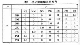 模糊控制规则的制定主要是根据专家知识确定。根据试验台上的所测数据即可估计出为维持理想的滑移速度而需要的合适的制动力矩的大致范围,再根据专家经验进行修正后通过多次仿真,几直到得到比较满意的效果为止。由于使用了专家知识,过分依赖于经验。本系统设计对其模糊控制关系矩阵进行优化,优化前模糊关系矩阵见表1。
