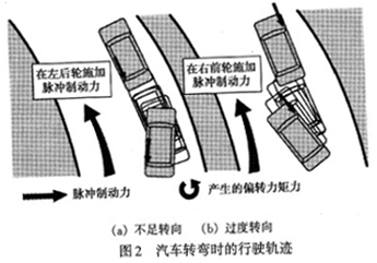 图2是汽车在转弯道路上行驶时的轨迹示意。见图2(a),当汽车驶入弯道时,假如驾驶员通过转向盘使汽车转向的转弯半径大于弯道半径,这种情况称为不足转向。如汽车车速过快,则汽车可能冲出路面。安装在汽车上的横摆率传感器会测出转向偏差,侧加速度传感器会测得右驶加速度偏大和转向盘转角传感器测得左转向不足,并立即监测到这种冲出路面的危险趋势,将信号输入电子稳定系统中的ECU。ECU立即指令在左后轮实施脉冲制动力,制动力在汽车质心产生一个向内偏转力矩,迫使汽车绕质心向内偏转一个角度。同时ECU立即指令发动机减少输出转矩,将汽车速度降下来,并代替驾驶员使汽车转向角度稍大一些,使汽车按弯道半径要求的转向角度行驶,回到正确路线上。