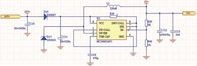 系统供电电路如图2所示,DC/DC转换芯片采用MC34063,该芯片具有集成基准电压、振荡器同步和输入电压范围宽等特点,其输出电压可表示为Vout=1.25(1+R39/R40),输出电流可达500mA,完全满足本系统的功耗要求。为了降低干扰,芯片的输入端和输出端加了电容C10、C12、C13进行滤波处理。