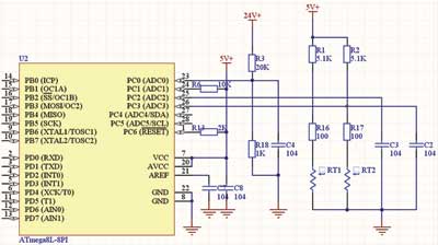 如图3所示,电压、温度检测采用单片机内部专用ADC采样通道,不增加额外芯片有利于降低系统成本。ADC基准电压等同单片机工作电压5V,系统输入电压经R3、R8分压简单滤波后送入PC0(ADC0),此端口根据分压比连续采样21次,然后将每次所得值相加即可还原系统输入电压;RT1、RT2为负温度系数传感器,当温度上升或下降时其阻值随之减小或增大,相应ADC端口将多次采样的电压值进行数值平均滤波并与已知的电压/温度区间比较,得出实时温度。