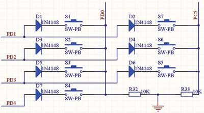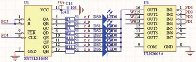 如图4所示,由于单片机I/O口有限,键盘和显示电路采用了端口复用,3位8段LED数码管驱动增加了SN74164串入并出芯片进一步缓解端口有限的压力。其中键盘有7个按键, 分别为开关机、制冷/通风、强制冷、设定、上增、下减,可以进行温度设置和新风时间设置等。LED数码管可以显示当前车内温度、系统预设温度、输入电压等,当蜂鸣器报警时能显示故障代码为维修调试提供了方便。