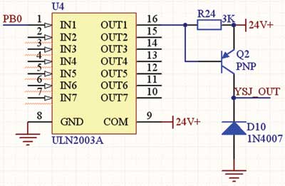 风机、压缩机输出控制电路如图5所示,单片机输出控制信号经ULA2003反向后驱动晶体管Q2,Q2的集电极再连接压缩机的起停开关继电器的控制输入端,当继电器由闭合转为断开时,二极管D10为继电器线圈续流。为有效的控制晶体管的导通和关闭,系统增加了高输入电压、高灌电流的ULN2003A驱动芯片。其内部采用达林顿输入电压最高达50V, 灌电流最大500mA。