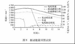 图9是制动能量回馈试验。从图中可以看出,加速踏板松开以后一段时间踩下制动踏板,大约在5s左右开始进行制动能量回馈,随着制动踏板行程的增大,电机制动转矩也逐渐增加。在一定时间段以后分离离合器,电机转速和车速随着制动转矩的作用逐渐下降,而发动机则进行停机控制。