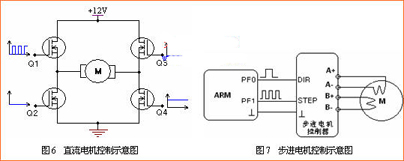 对执行机构的输出控制包括对EPS直流电机和减振器步进电机的控制。直流电机控制可分为励磁控制和电枢控制两种方法。这里采用开关控制方式驱动功率场效应晶体管,通过脉冲宽度调制PWM控制电枢电压实现转速控制。图6所示为直流电机控制示意图[7],定义ARM的端口PE3、PE4、PE5、PE6输出直流电机控制信号,经过四个驱动光耦分别加到四个MOS开关管Q1、Q2、Q3、Q4控制端。当要求电机正转时,Q1受PWM 信号控制,同时Q4被施加高电平导通,Q2、Q3被施加低电平截止;当要求电机反转时,Q3受PWM信号控制,Q2被导通,Q1、Q4被截止,方便实现了电机的方向控制和转速控制。