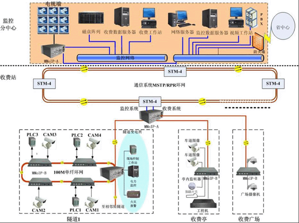 l 收费站MMOIP的汇聚口与通信系统SDH/MSTP以太网接口连接,由通信系统负责传输监控图像到监控分中心。收费数据和监控数据在通信系统中完全独立地传输到监控分中心。