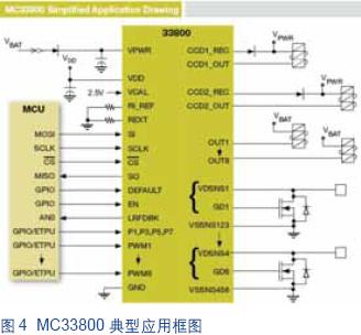 在发动机控制应用中,MC33811提供的诊断功能可以及时汇报喷油器故障,以防止损坏发动机。同时还可以用于其他需要诊断电磁阀的应用中,如变速箱控制器或电磁气门控制器。